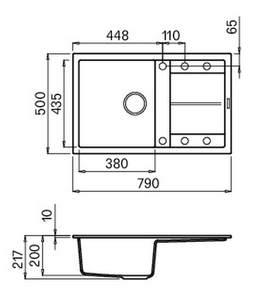 Integrovaná oblast pro příslušenství v odkapávači, vybavená předvrtanými otvory, které vám umožňují instalovat doplňky: excentrické ovládání odpadu, dřezovou baterii s vytahovací sprchou a dávkovač saponátu.