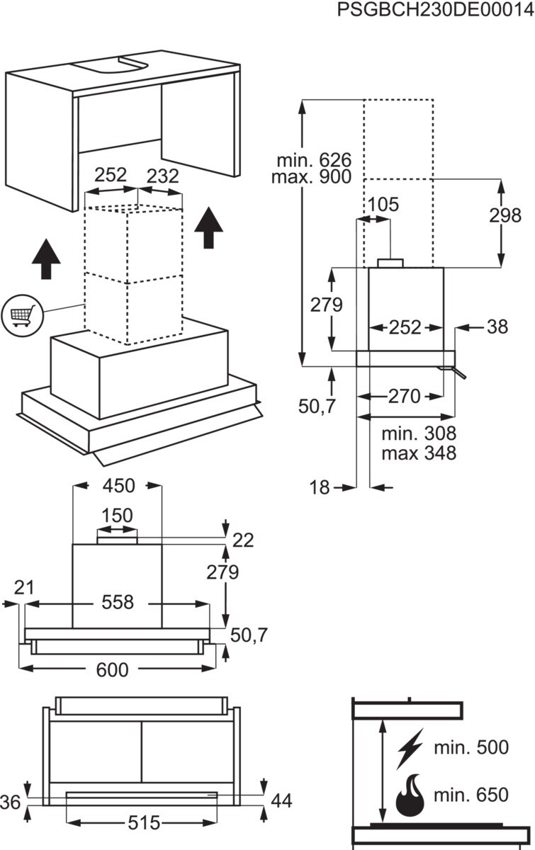 Typ odsavače: Výklopný, vestavba do skříňky, šířka 60 cm