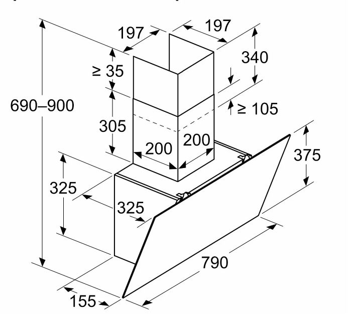 rozměry spotřebiče pro odvětrávání (V x Š x H): 690-900 x 790 x 325 mm