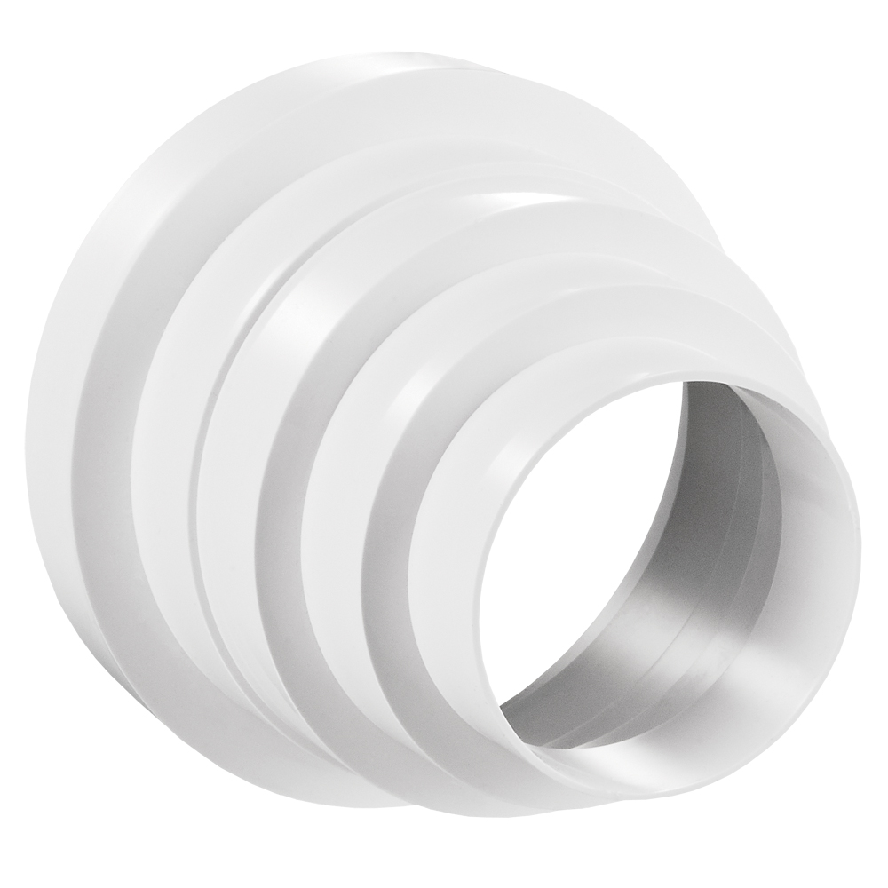 Univerzální plastová redukce pro napojení vzduchovodů různých průměrů Ø 80 mm, Ø 100 mm, Ø 120 mm, Ø 125 mm, Ø 150 mm nebo komponentů.