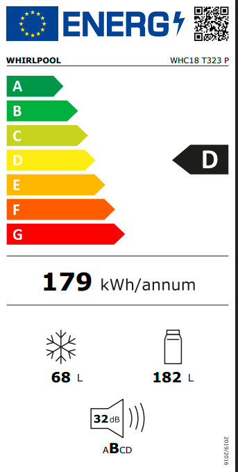 Součet objemů chladicích a nemrazicích oddílů (EU2017/1369): 182
