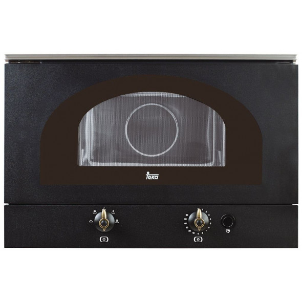 Vestavná rustikální mikrovlnná trouba, výkon 850 W, černé provedení, kapacita 22 l, rozměr 60 x 39 cm, časovač, otočné ovladače, dvě skla dvířek.