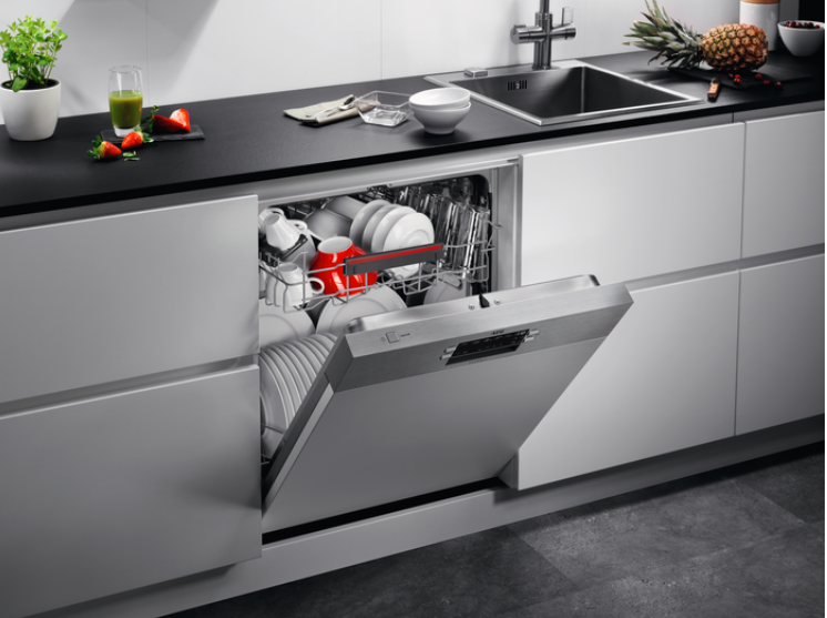 Horní košík má skládací poličky na šálky, plastové barevné madlo