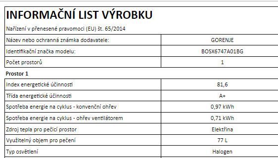 | Objem trouby L | 77 |