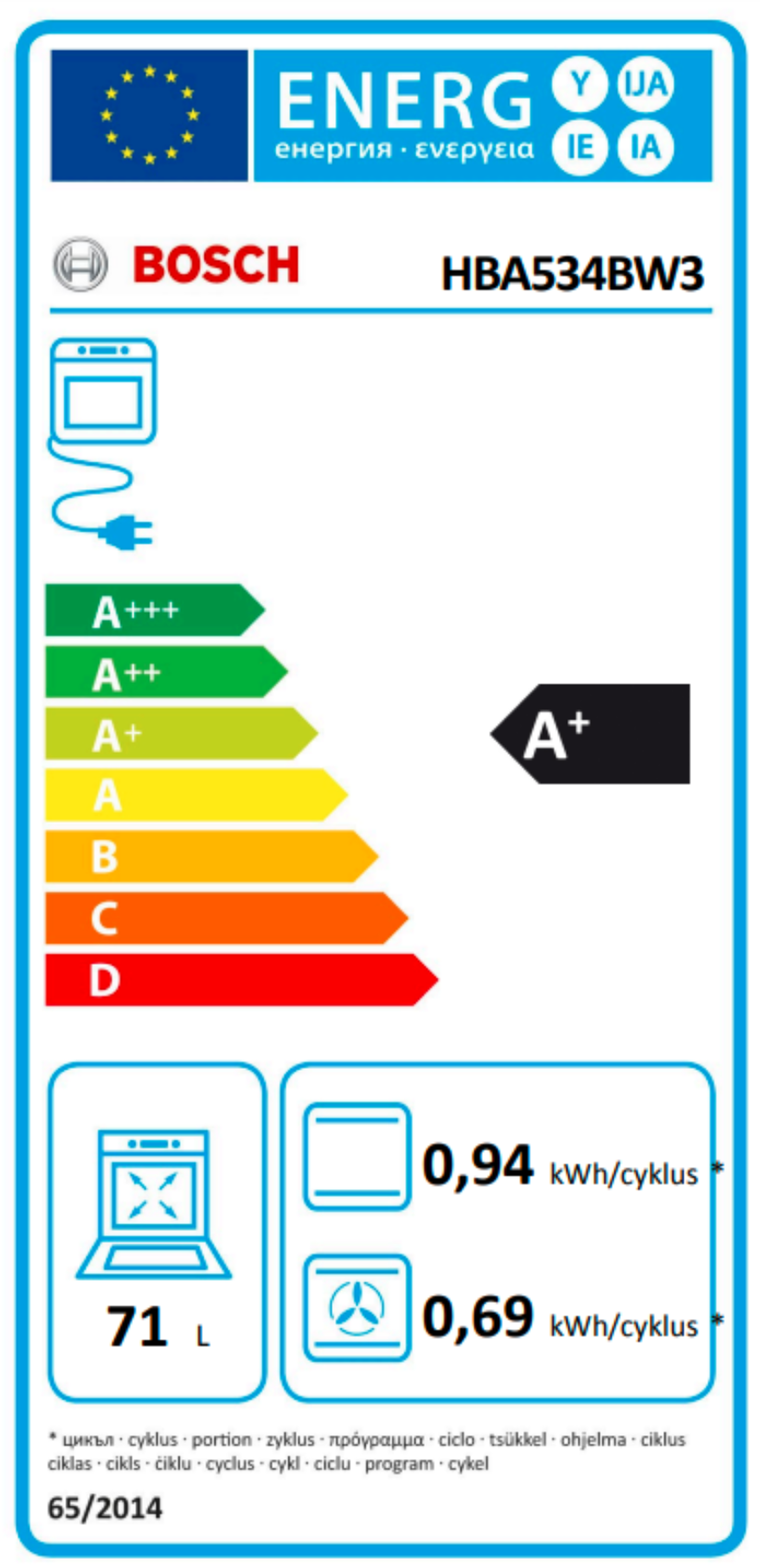 spotřeba energie na cyklus při konvenčním ohřevu:0.9 kWh(na stupnici třidy energetické účinnosti od A+++ do D)